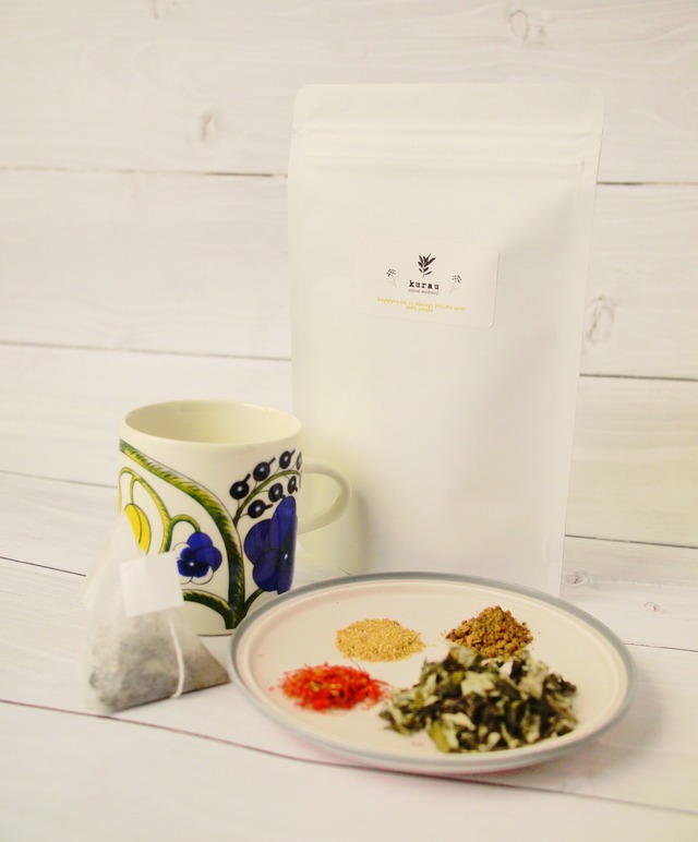 <冷えに悩む女性のためのお茶>です。 このお茶を作るきっかけになったのは、よもぎ蒸しサロンのオーナーさんより 妊活用のお茶をオーダー頂いたことが始まりです。 妊活は東洋医学からみて、体を温め整えることがポイント。 冷えは大敵です。 私自身が末端冷え性で汗をかきにくい体質なのですが よもぎ蒸しに入った時だけ、思いっきり汗をかけて ものすごくスッキリし、その良さを知っていたことで これをお茶にしたらどうだろうか?と制作を始めました。 正直、よもぎの味はクセが強くて慣れないと 飲みにくいのではないかと悩み試行錯誤の連続でした。 そして冷えを改善するのに必要な素材を組み合わせていくうちに 黒豆のコクとヨモギのさっぱりとした味が相まって 素材の甘みを楽しめる薬膳茶に仕上がりました。 陽だまりのぽかぽか茶は、 日向ぼっこをしているかのような体の心地良さを感じて頂けるかと思います。 そして、手足の先までぽかぽかになっていくのを ぜひ体感して頂きたいです。 ================================== ◆成分説明◆ よもぎの主成分はクロロフィルで新陳代謝を高めてくれます。また、ビタミンがたっぷり含まれており、その中でもビタミンKは血液凝固、血液の造血を助け、血管内をきれいに保つ効果があります。他にも、ビタミンCはストレスへの抵抗力を強め、鉄の吸収を良くする働きがあり、女性に嬉しい栄養がたっぷり入っています。 ◆内容◆ 焙煎黒豆・三年番茶・よもぎ・陳皮・紅花 1袋10個入り ※1包 マグカップなら200㏄~300㏄程抽出可能 水筒なら500㏄程度抽出可能 ティーバッグは最後まで入れたままでOK ◆kurauの薬膳茶◆ 当店の薬膳茶は、1つひとつ手作りしています。 ※開封後はお早めにお飲みください。直射日光や高温多湿を避け、保存してください。