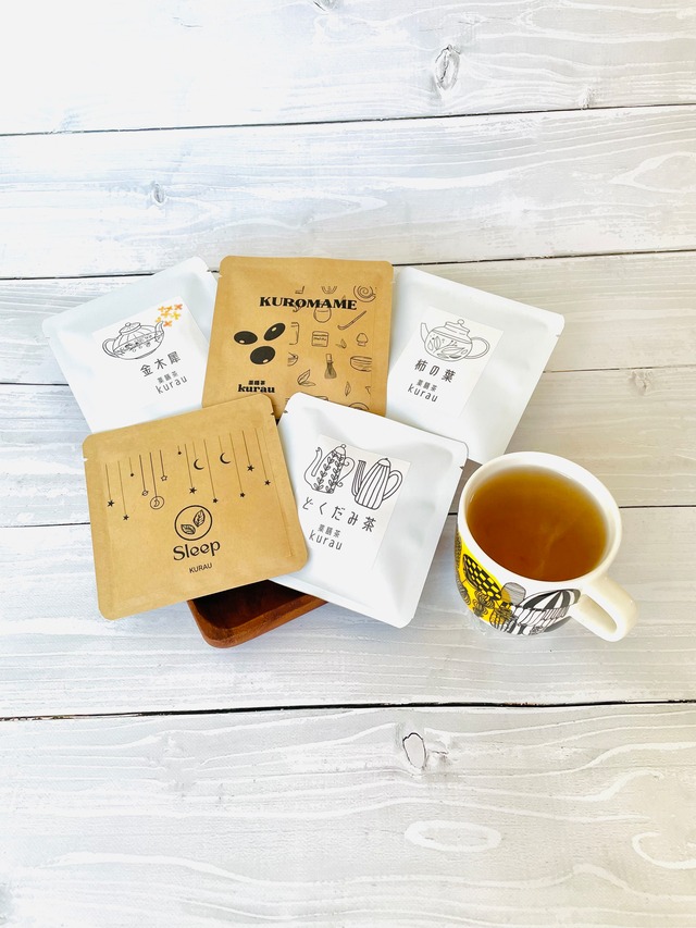 ★NEW★ ~暮らしに寄り添う 休息茶の贅沢セレクション~ 日々の喧騒の中で、心を休めるひとときを大切にしたい方へお届けします。「暮らしの休息茶5選 おもてなしプレミアム」は、リラックス効果を追求した特別なお茶のセットです。選りすぐりの素材を組み合わせ、それぞれが持つ本来の力が、心身の疲れを癒してくれます。 心地よい香りと、身体を温める成分が溶け込んだお茶は、あなたのリラックスした時間をさらに豊かにしてくれることでしょう。 お友達やご家族とのひととき、また自分自身へのご褒美に、一杯の休息茶をぜひご堪能ください。 ================================== ◆成分説明◆ 厳選されたハーブや茶葉が絶妙にブレンドされており、それぞれが持つ香りや効能が、ストレス軽減やリラクゼーションに貢献します。特に、kurauの薬膳茶は心を落ち着ける効果が期待される他、体を温める要素も含まれているため、心地よい眠りへと導きます。 ◆5種の内容◆ ①陽だまりのぽかぽか茶 焙煎黒豆 よもぎ 陳皮 松葉 ②寒い季節も元気をキープする柿の葉 柿の葉、どくだみ、陳皮、桑の葉、松葉 もしくは ②薬に頼らない暮らし【朝さんぽしたくなる森林浴茶】 枇杷葉・桑の葉・三年番茶・陳皮・紅花 ③金木犀のやさしさ 静岡紅茶 きんもくせい アンゼリカ 陳皮 ④世にも美味しいどくだみ茶 はとむぎ、どくだみ、羅布麻、陳皮 ⑤ほっとやすらぐ飲む休息茶 クロモジ 羅布麻 セントジョーンズワート ホーソンリーフ 各1袋1包入り ※1包 マグカップなら200㏄~300㏄程抽出可能 水筒なら500㏄程度抽出可能 ティーバッグは最後まで入れたままでOK ◆kurauの薬膳茶◆ 当店の薬膳茶は、1つひとつ手作りしています。 ※開封後はお早めにお飲みください。直射日光や高温多湿を避け、保存してください。